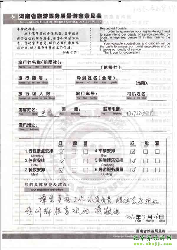 2010年7月16日王小姐旅游質(zhì)量反饋:導(dǎo)游認(rèn)真負(fù)責(zé),服務(wù)態(tài)度很好